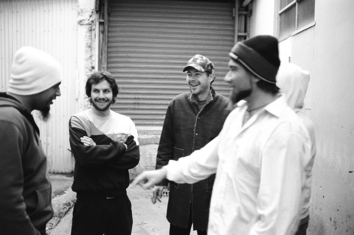 Trinity Roots & Dr Lee outside The Surgery. L-R Rio Hemopo, Lee Prebble, Toby Larmer (band manager), Riki Gooch, Warren Maxwell, circa 2001